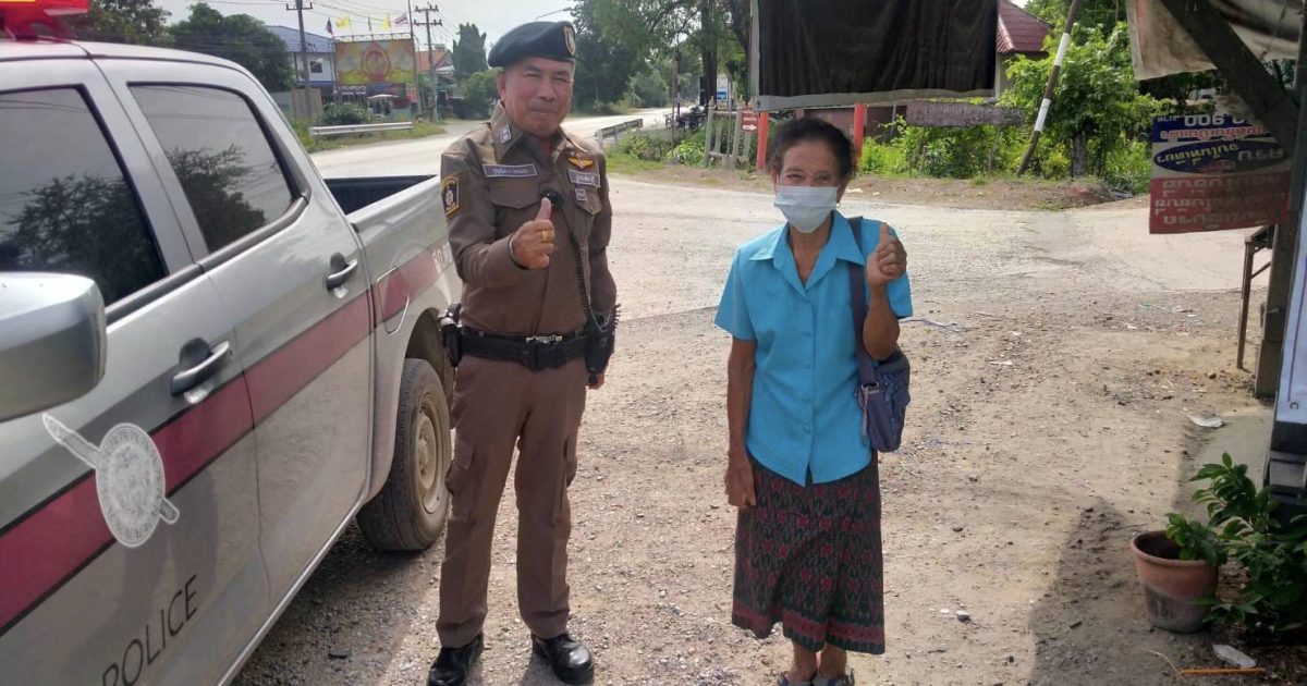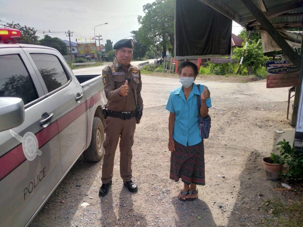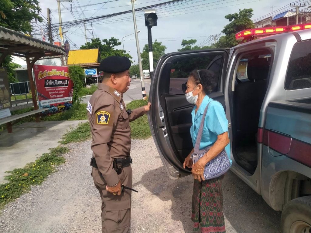 สายตรวจ 20 พร้อมกำลัง ว.4 ช่วยเหลือพาคุณยาย นางสยาม กลิ่นชาติ อายุ 73 ปี จากโรงพยาบาลดอนพุด ไปส่งที่ศาลารอรถโดยสาร ต.บางนา อ.มหาราช เพื่อรอญาติมารับกลับบ้านต่อไป