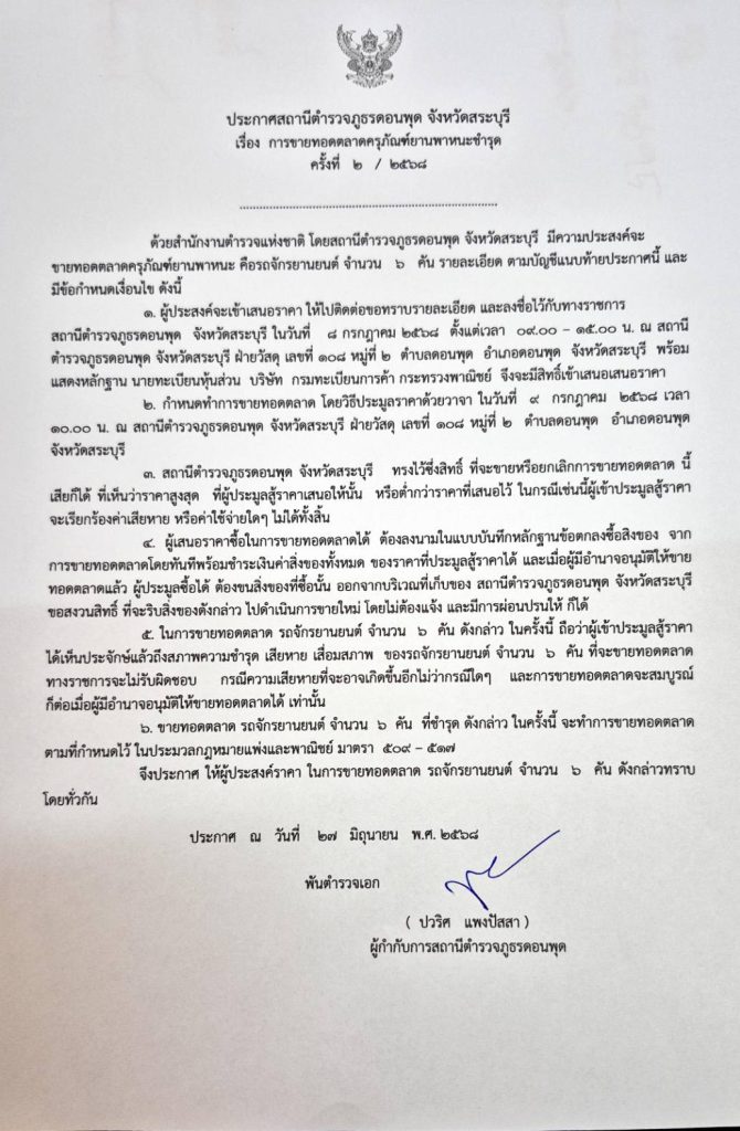 ประกาศการขายทอดตลาดครุภัณฑ์ยานพาหนะชำรุด 1 กรกฎาคม 2568 โดย Admin / ข่าวจัดซื้อจัดจ้าง,ประกาศต่างๆ เกี่ยวกับการจัดซื้อจัดจ้าง